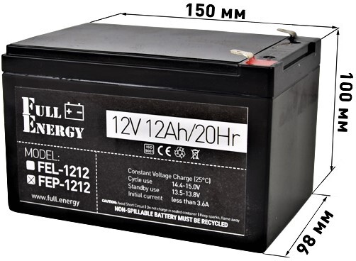 Аккумулятор 12Ah/12В, технология AGM, размеры: 150х100х98мм. Применяется для установки в бесперебойные блоки питания и подобные устройства для обеспечения непрерывного питания 12-вольтовых устройств.
