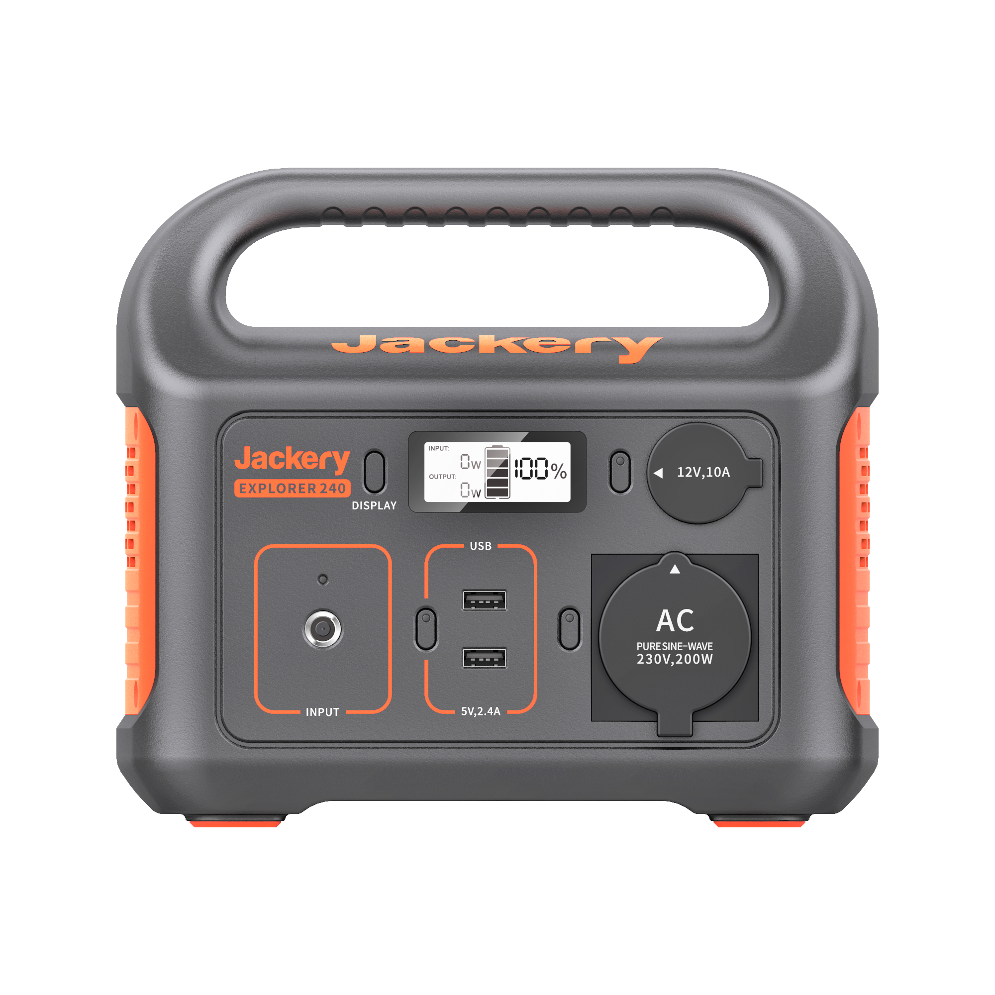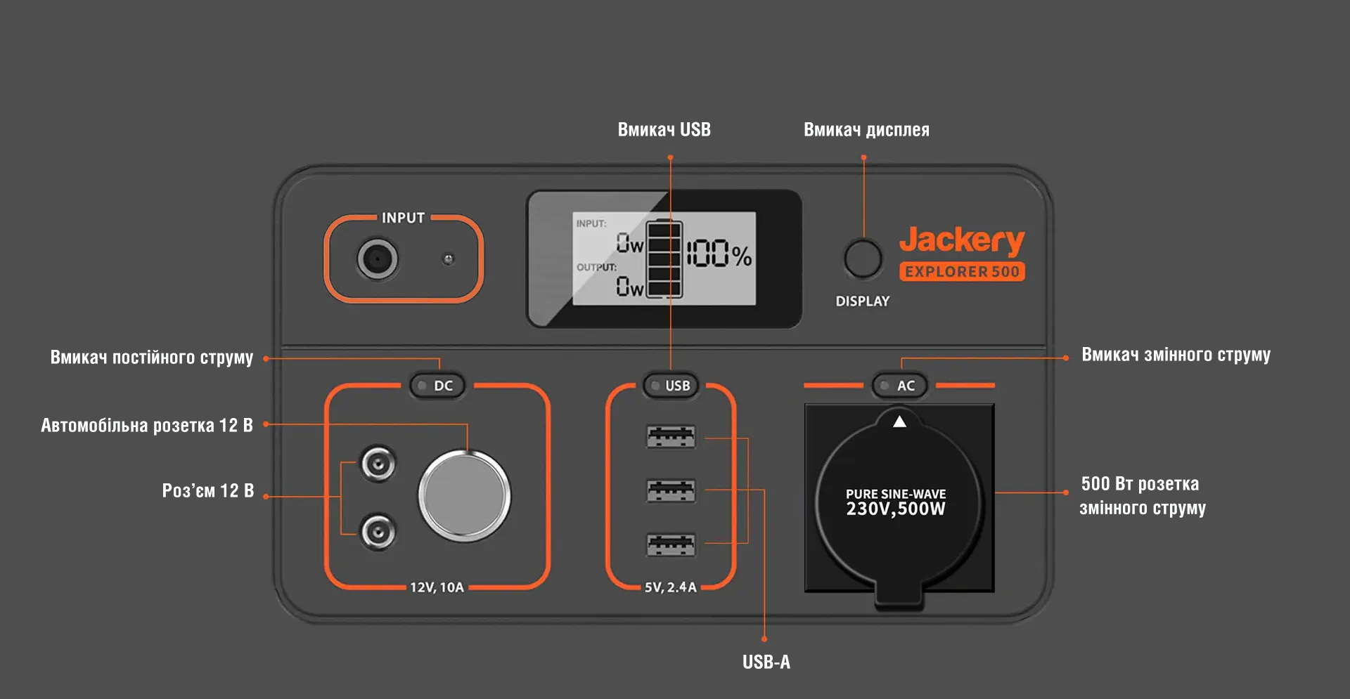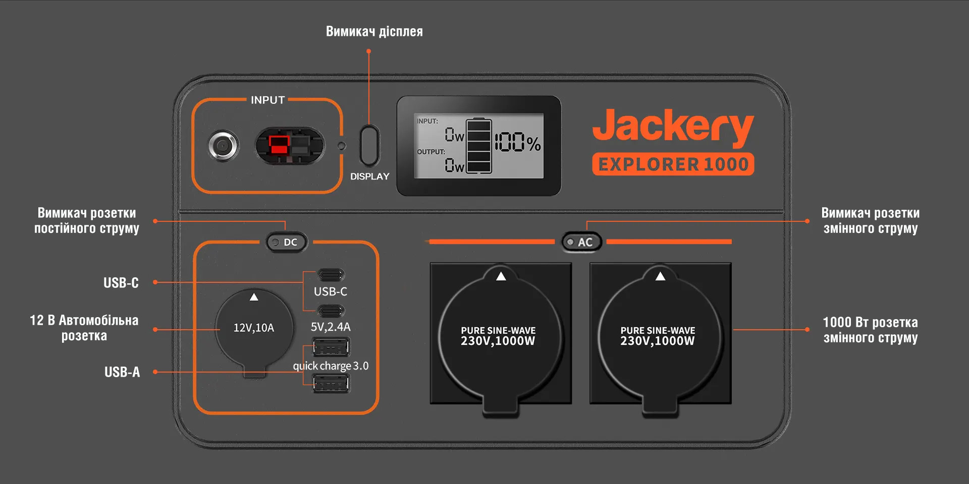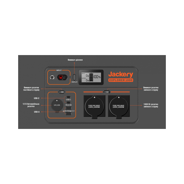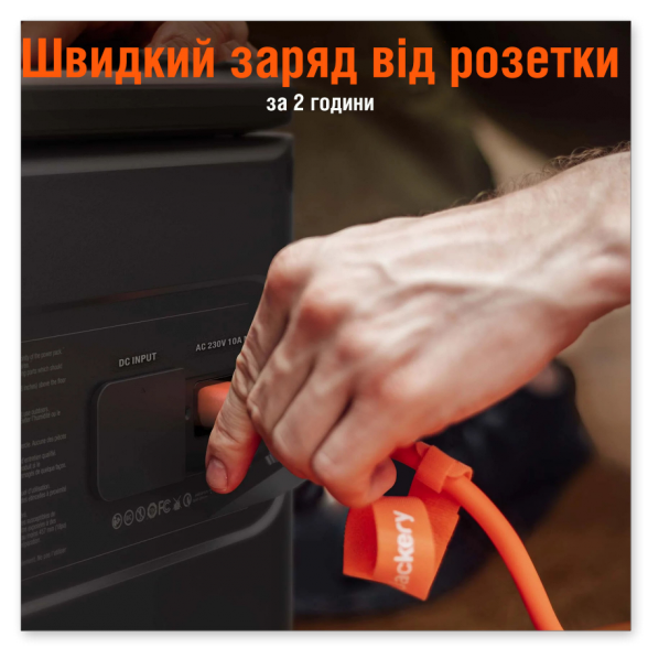 ВИХІДНІ ПОРТИ: Вихід змінного струму (2) - 230 В, 50 Гц, 9,56 А, номінальна потужність 2200 Вт, пікова потужність 4400 Вт. Вихід USB-A (2) - Quick Charge 3.0, макс. 18 Вт, 5-6 В⎓3 А, 6-9 В⎓2 А, 9–12 В⎓1,5 А. Вихід USB-C (2) - Макс.100 Вт, 5 В⎓3 А, 9 В⎓3 А, 12 В⎓3 А, 15 В⎓ 3 А, 20 В⎓5 А. Автомобільна розетка (×1) - 12 В⎓10 А.