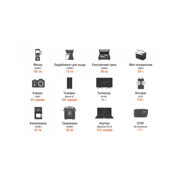 Акумулятор Літій-іонний - 24 Aг / 21,6 В (518,4 Вт*г), Вихід пост. струму - 2 (дві точки підключення) х 12В = 7A, Автомобільна розетка - 12В = 10A, USB-вихід - 3 х USB-A: 5В = 2,4A, Циклічний - > 1000