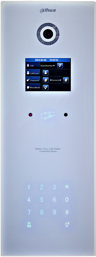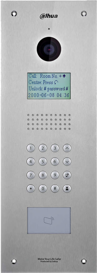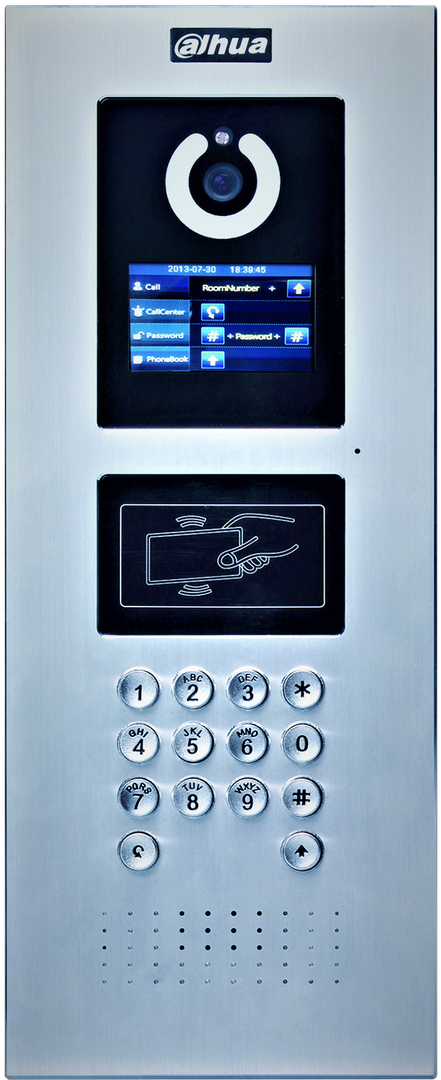 БУДИНКОВІ БАГАТО ПОВЕРХОВІ. Встановлення на під’їздах багато поверхових будинків. Виклик квартири відбувається набором номера квартири або консьєржа якщо в бажаний квартирі домофон відсутній. Консьєрж через на своєму пульту домофонної системи отримує відео виклик та приймає рішення на дозвіл проходу. Консьєрж при наявності домофону в квартирі може зв’язатись з квартирою та отримати згоду на пропуск відвідувача. Панелі виклику мають вмонтований зчитувач карток контролю доступу що забезпечить вільний контрольований прохід жителів будинку. Монітор домофону підтримує IP камери котрі можливо підключити на встановлені монітори в квартирах для перегляду додатково будинкових територій