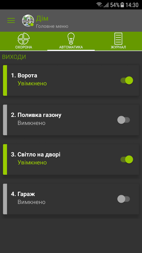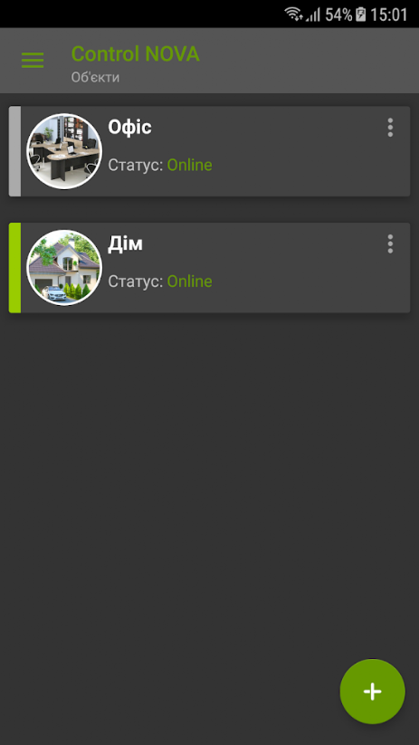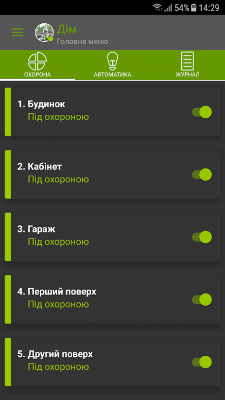 Управління та контроль за охороною декількох об’єктів з однієї програми. Натисніть на іконку і ви потрапите до вибраного об’єкту. З можливостю керувати охороною та виконавчими приладами.