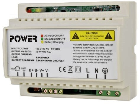 Безперебійний блок живлення імпульсний, одноканальний, для кріплення на DIN-рейку. Живлення AC100-240V / 50-60Hz клеммник, вихідна напруга DC12 ... 14V/3A, клеммник. Захист від перенапруги, КЗ, перевантаження по струму, а також захист заряду / розряду акумулятора. Корпус пластиковий. Розміри: 107 х 87 х 63 мм.