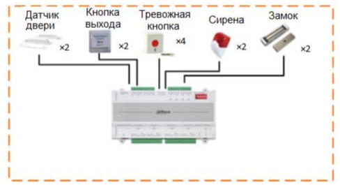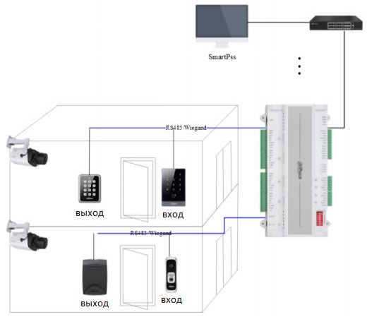 Мережеве обладнання контролю доступу рішення від однієї точки проходу до сотень. Кожний контролер працює в мережевому підключенні, а також по протоколу «485». При зчитуванні карток підв’язуються зображення з камер спостереження. Система СКД працює з програмним забезпеченням DSS Client котре одночасно працює з відеоспостереження домофоном, сповіщення з охоронних систем.