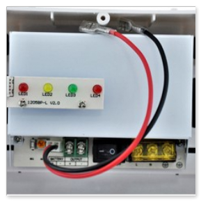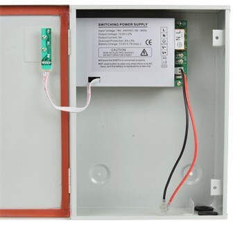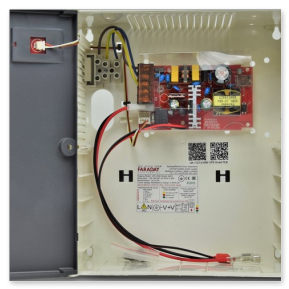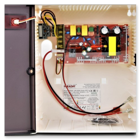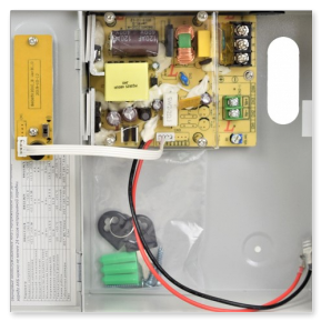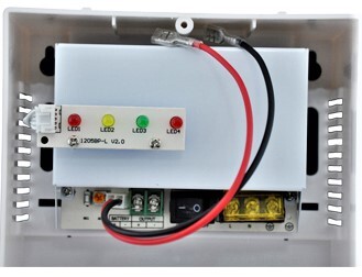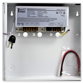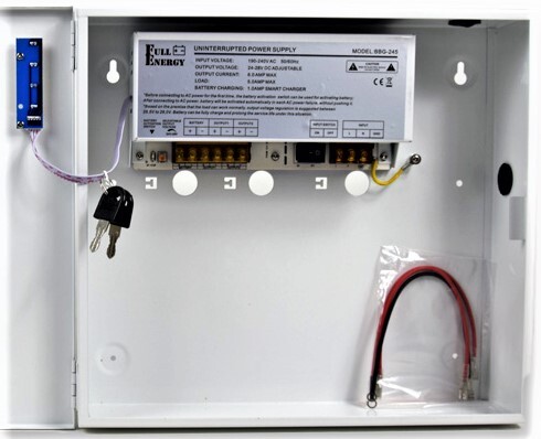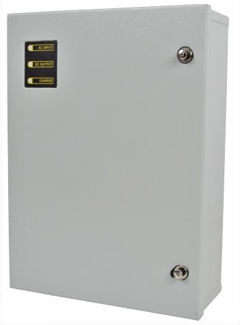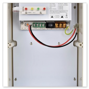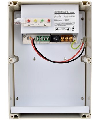 Безперебійний блок живлення, імпульсний, двоканальний; вихід: 24В/5А, клемник; вхід: ~100-240В, клемник; металевий корпус з кришкою і замком; стабілізація напруги, захист від глибокого розряду. Можливе встановлення 2 акумуляторів 7Ah. Розміри 338 х 308 х 83 мм