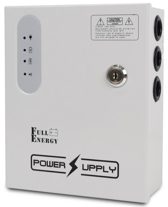 Безперебійний блок живлення імпульсний, 4-х канальний. вихід: 12...14В/4А клемник; вхід: ~175...245В, клемник; металевий корпус з кришкою і замком; стабілізація напруги, захист від глибокого розряду. Можливе встановлення акумулятора 1,2Ah, 2.2Ah, 4Ah, 7Ah. Розміри: 200 х 163 х 72 мм