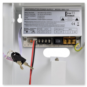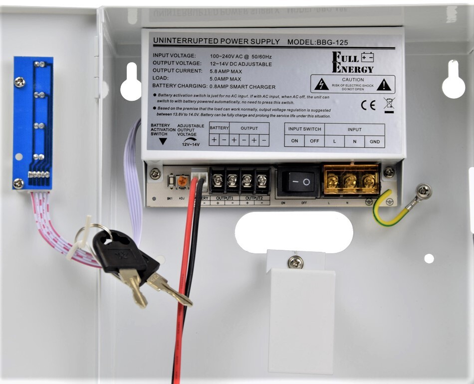 Безперебійний блок живлення імпульсний, вихід: 12...14.2В/5А, клемник; вхід: ~100...240В, клемник; металевий корпус з кришкою і замком; стабілізація напруги, захист від глибокого розряду. Можливе встановлення акумулятора 1,2Ah, 2.2Ah, 4Ah, 7Ah. Розміри: 225х195х80мм
