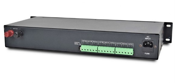 Розподільний блок безперебійного живлення на 9 виходів із можливістю підключення зовнішнього акумулятора. Вхідна напруга 190-240 В AC, 50 / 60 Гц, вихідна напруга DC 12-14 В / 10А (при живленні від батареї 10-12.5 В). Самовстановлюючий запобіжник (PTC). Підходить під стійку 19". Габаритні розміри: 440 х 225 х 67 мм.